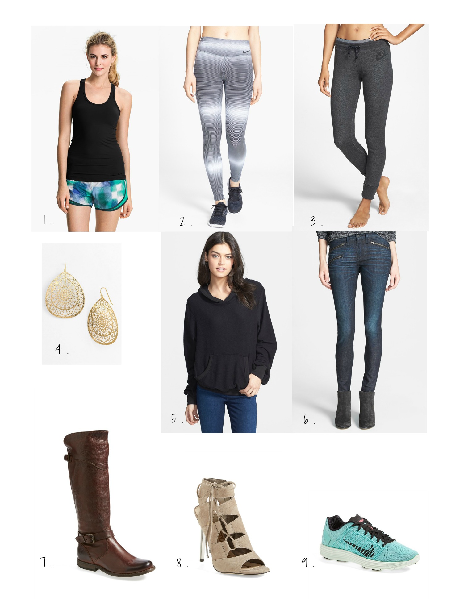 1. Nike ‘Knockout’ Racerback Tank 2. Nike ‘Legenday’ Print Dry-Fit Tights 3. Nike ‘District 72’ Leggings 4. Argento Vivo Teardrop Earrings 5. Wildfox ‘Malibu’ Pullover Hoodie 6. Rag & Bone Zip Detail Skinny Jeans 7. Frye ‘Phillip’ Riding Boot 8. Sam Edelman ‘Palma’ Suede Sandal 9. Nike ‘Lunaracer+ 3’ Running Shoe