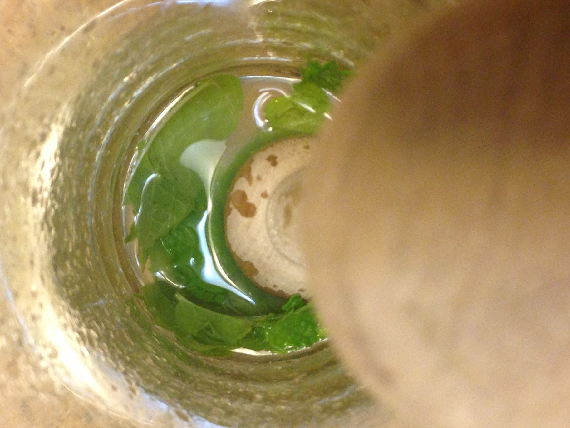 In a tall glass muddle about 8 mint leaves with the juice of 1 lime. IMG_5667