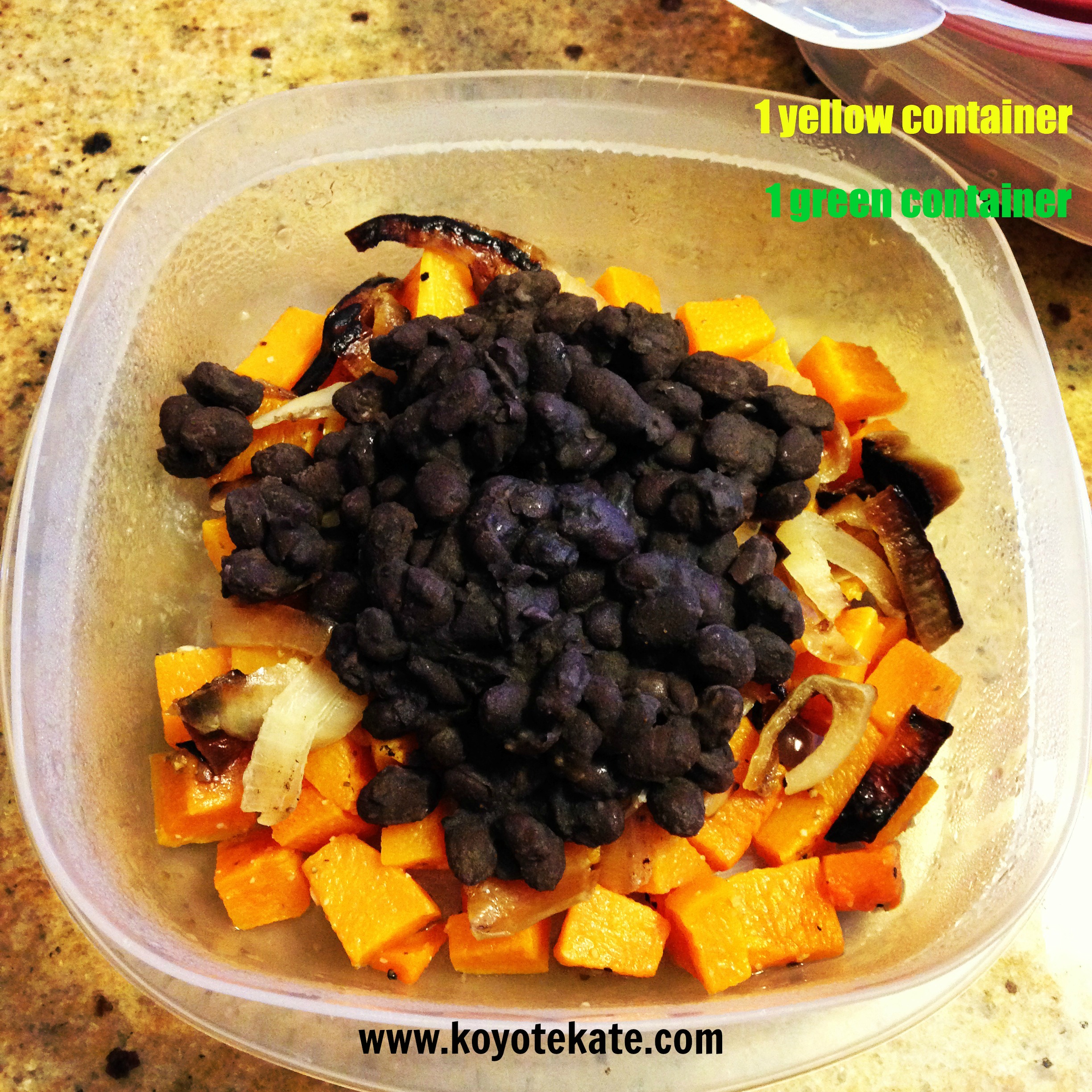 Cut 1 tortilla in half (for the 21 day fix 1 tortilla = 1 yellow container). Fill green container with squash/onion mixture. Fill yellow container with black beans. Fill blue container with shredded fontina cheese.